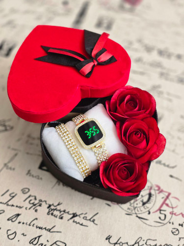 باکس هدیه زنانه شامل ساعت دیجیتال LED لمسی و دستبند نگینی و باکس و گل