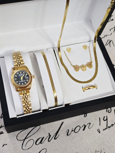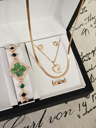 ست ساعت زنانه همراه دستبند وگردنبند وانگشتر شیک مناسب کادو همراه جعبه