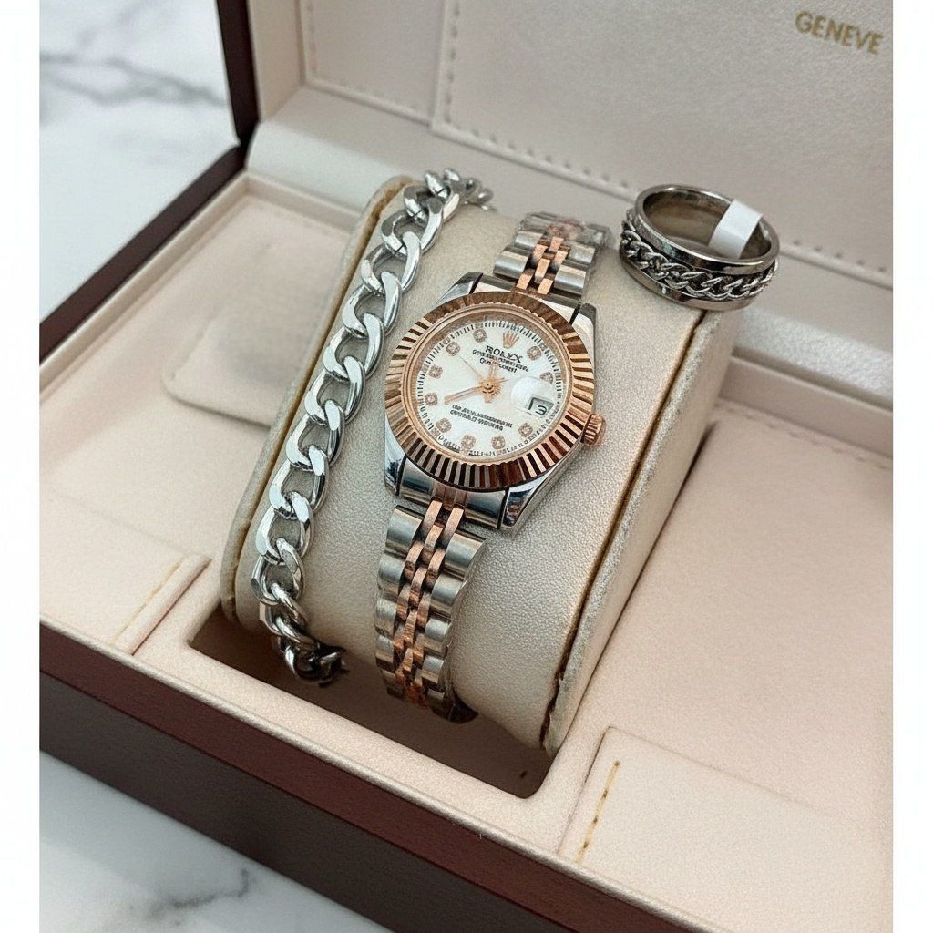 ست زنانه و دخترانه ساعت رولکس تقویم دار و دستبند و نیمست استیل و حلقه