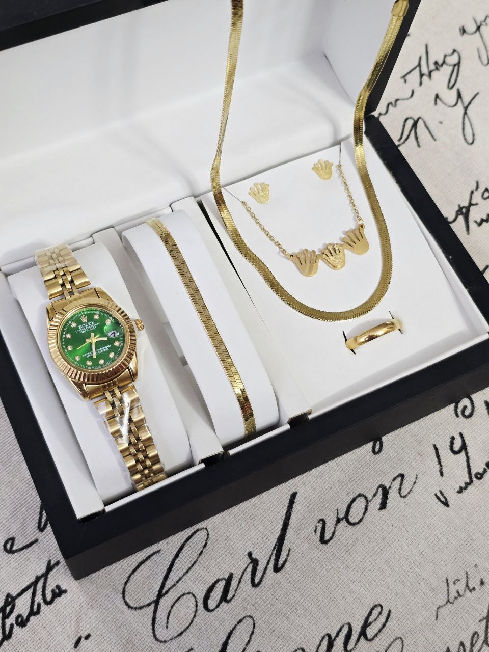 ست ساعت زنانه همراه دستبند وگردنبند وانگشتر شیک مناسب کادو همراه جعبه